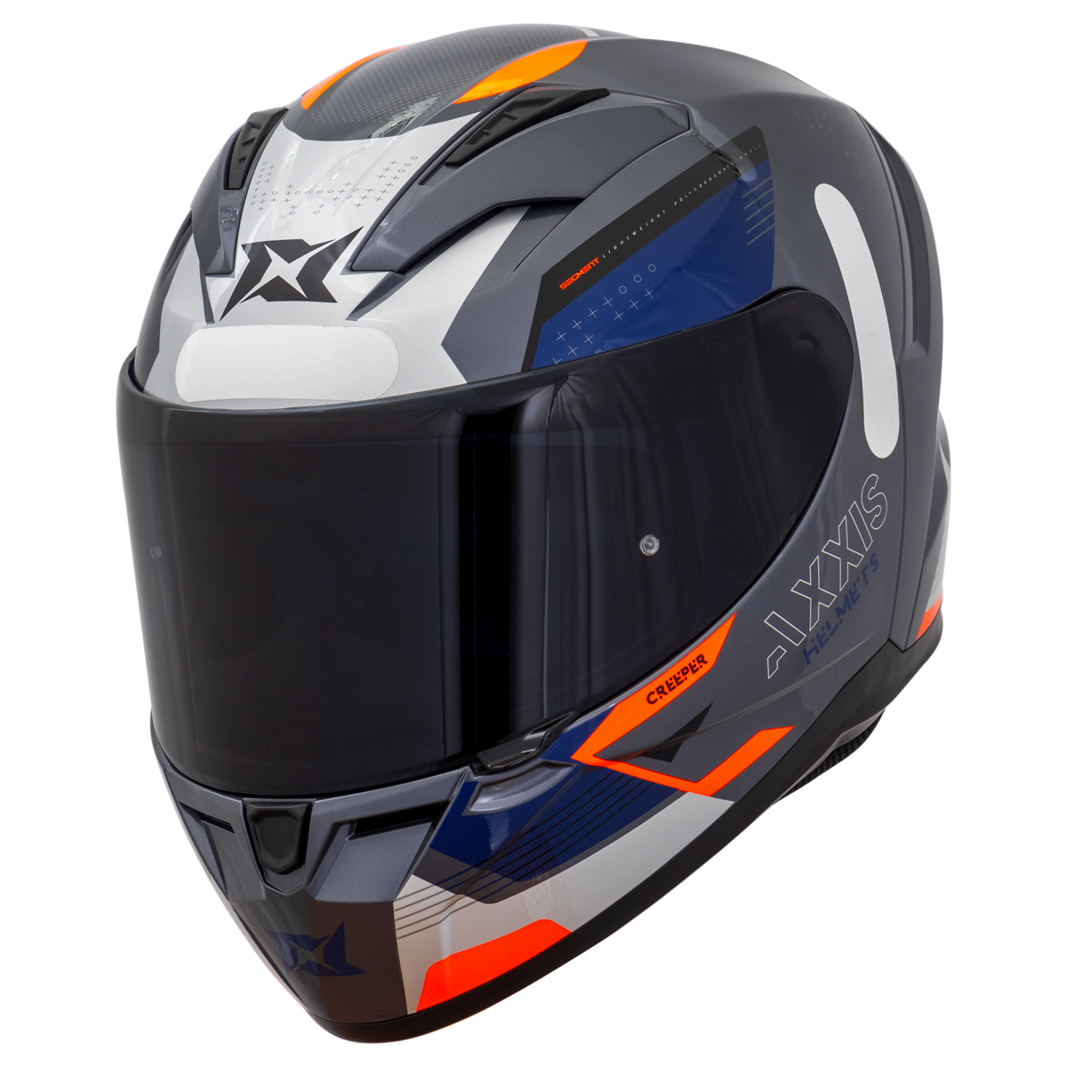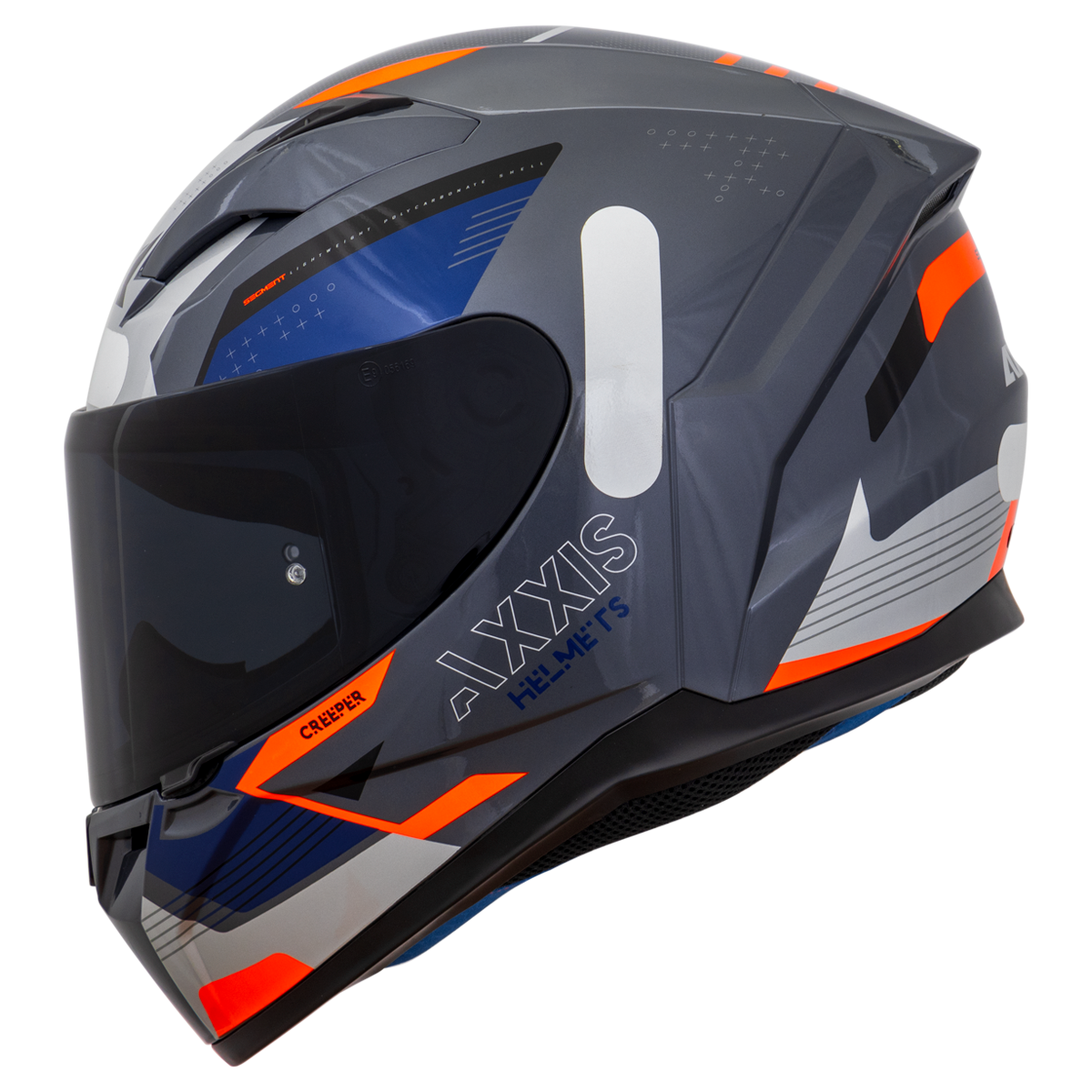 Capacete integral AXXIS Segment Creeper C2 Gloss: certificações ECE 22.06, DOT e Inmetro, construção em HIRP com aerofólio integrado para maior estabilidade, ventilação eficiente, forro removível e lavável, viseira óptica de 2,2 mm compatível com Fogoff, peso aproximado de 1.600 g.