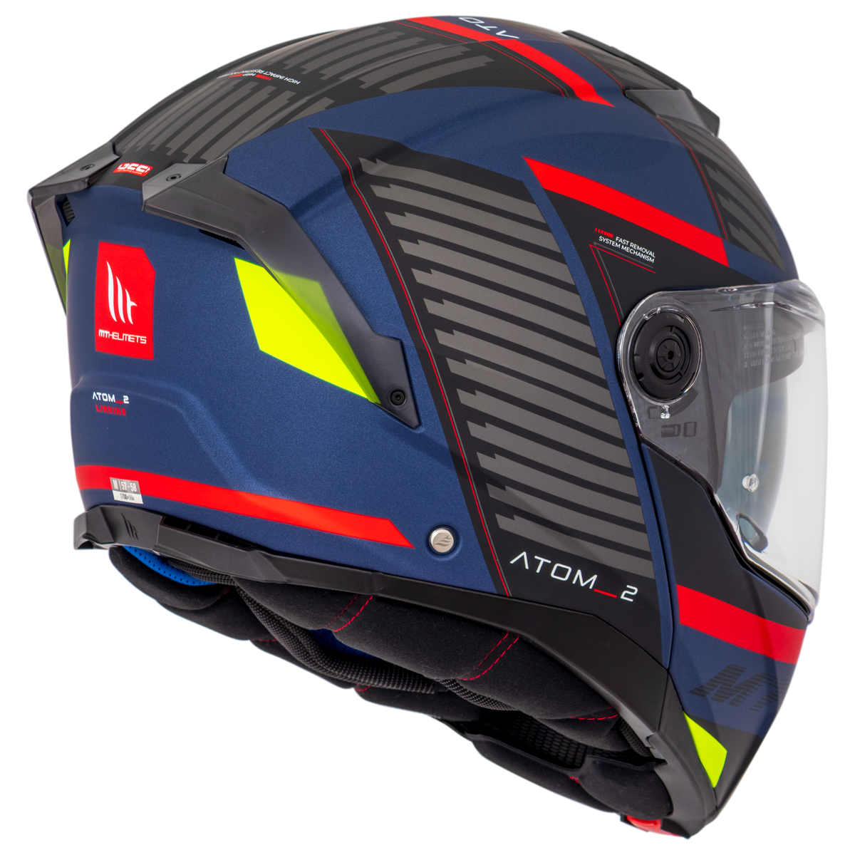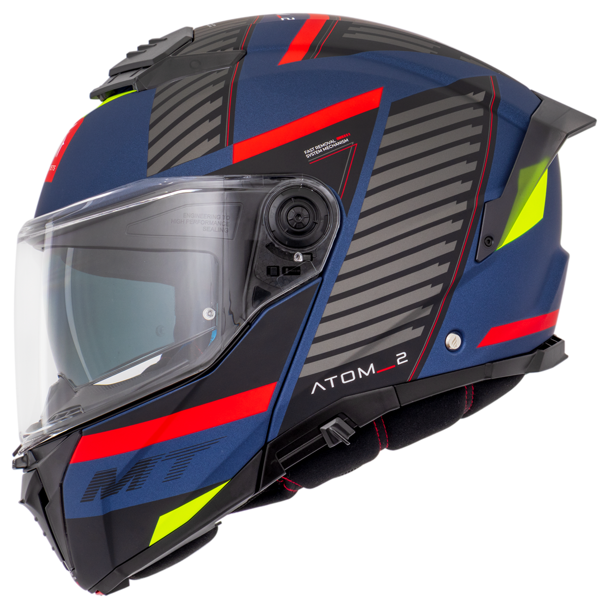 Outro ponto importante a se destacar é a sua versatilidade. O MT Atom 2 SV é, igualmente, um capacete modular conversível, equipado com protetor solar interno anti-riscos em policarbonato óptico. Dessa forma, ele proporciona uma excelente visão, sem distorções, e, adicionalmente, permite a troca rápida da tela, facilitando, assim, o uso em diversas situações.
