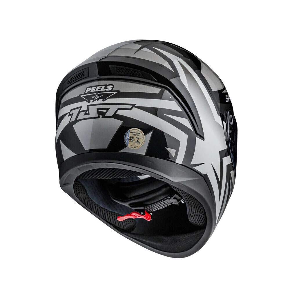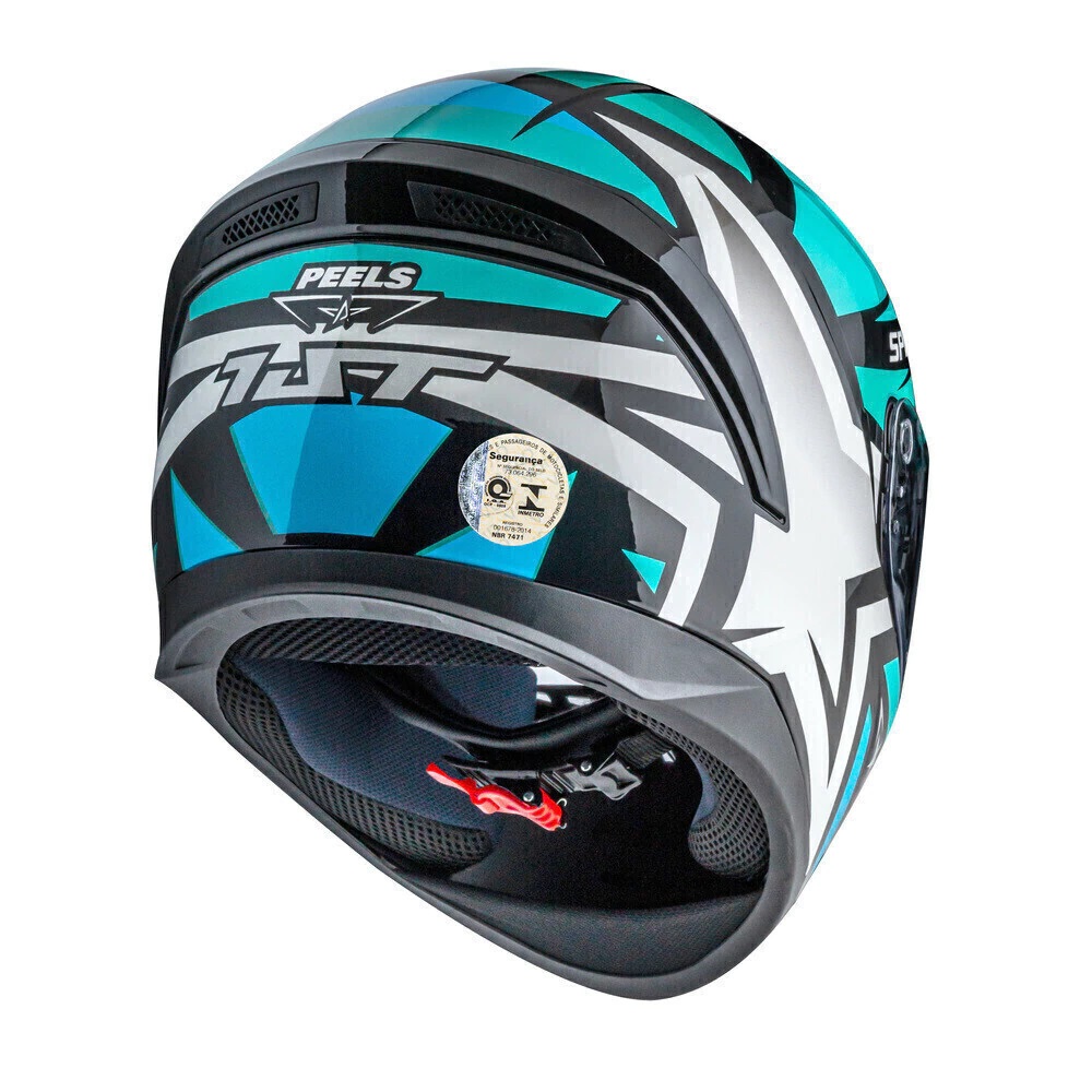 Capacete Peels SpikeII 1ST no quesito segurança, o casco é produzido em termoplástico ABS de alta absorção de impacto, garantindo resistência e proteção. Da mesma forma, a cinta jugular com fecho micrométrico oferece praticidade no ajuste e mais firmeza durante a pilotagem.